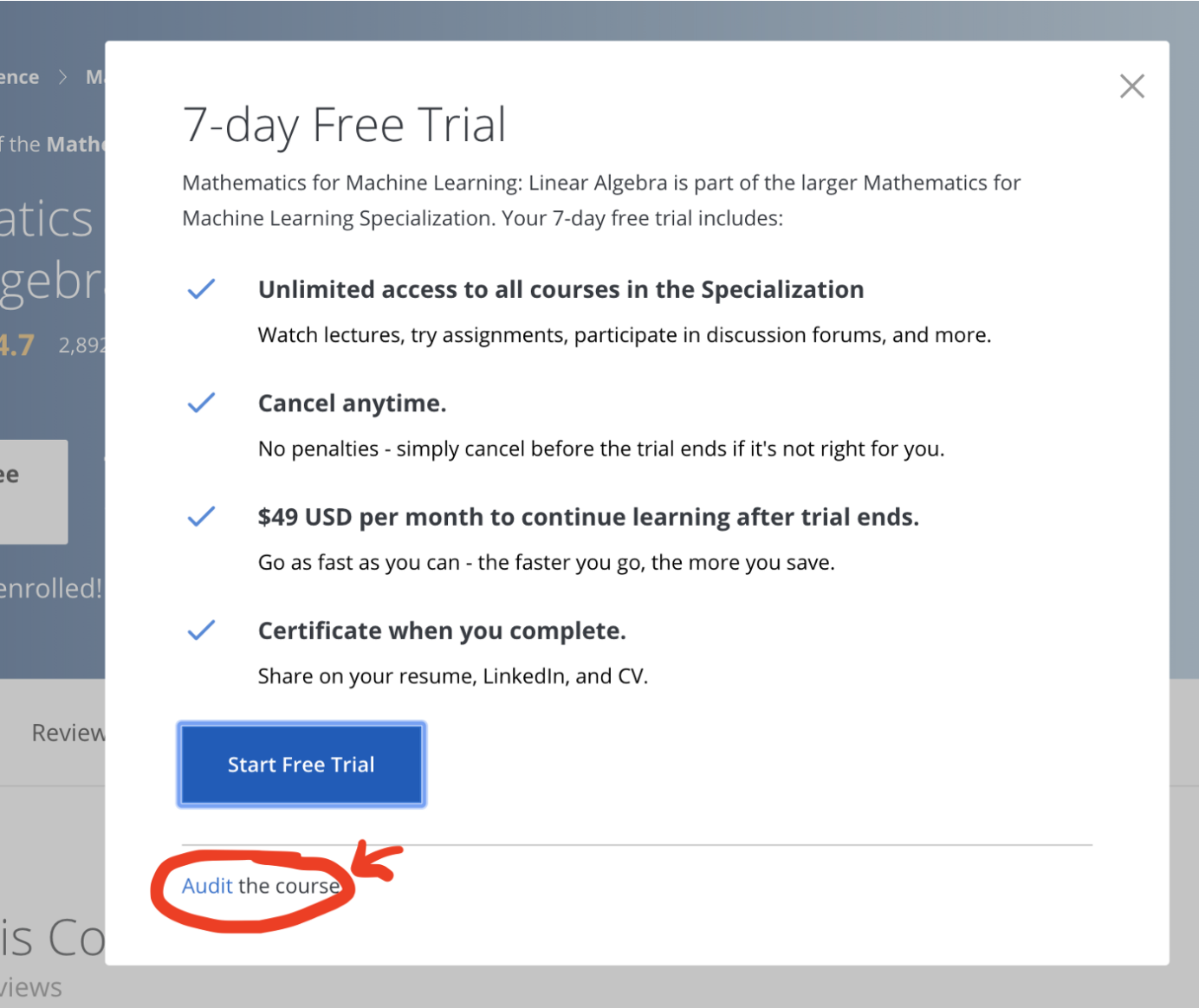 - 找到字很⼩的Financial aid available (在Try for Free: Enroll to start your 7-day full access free trial那一行下面)