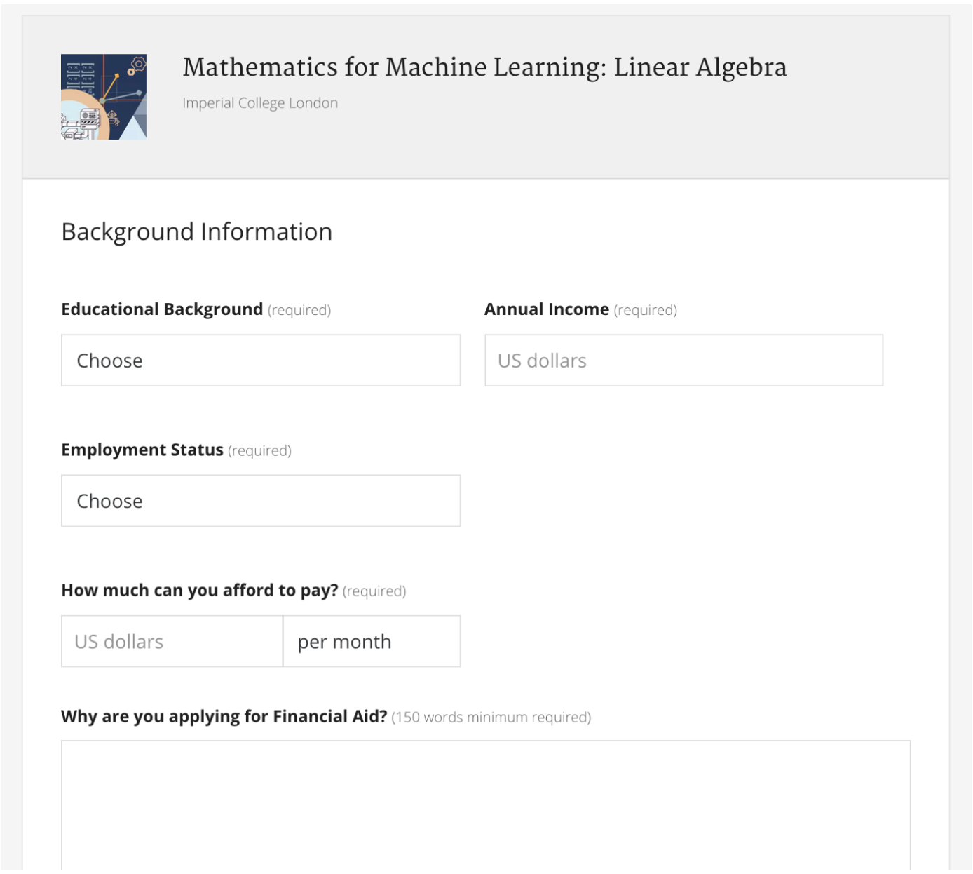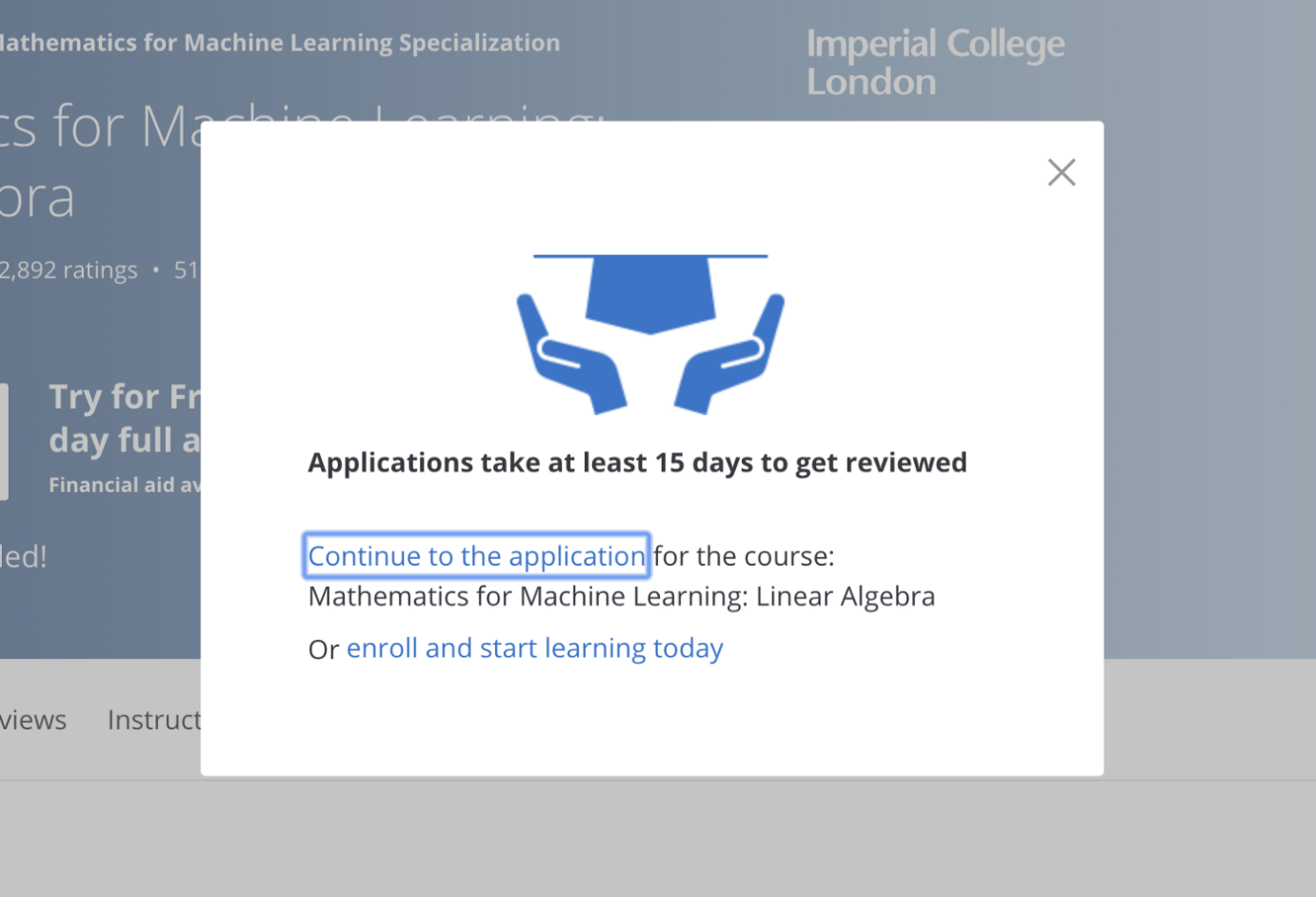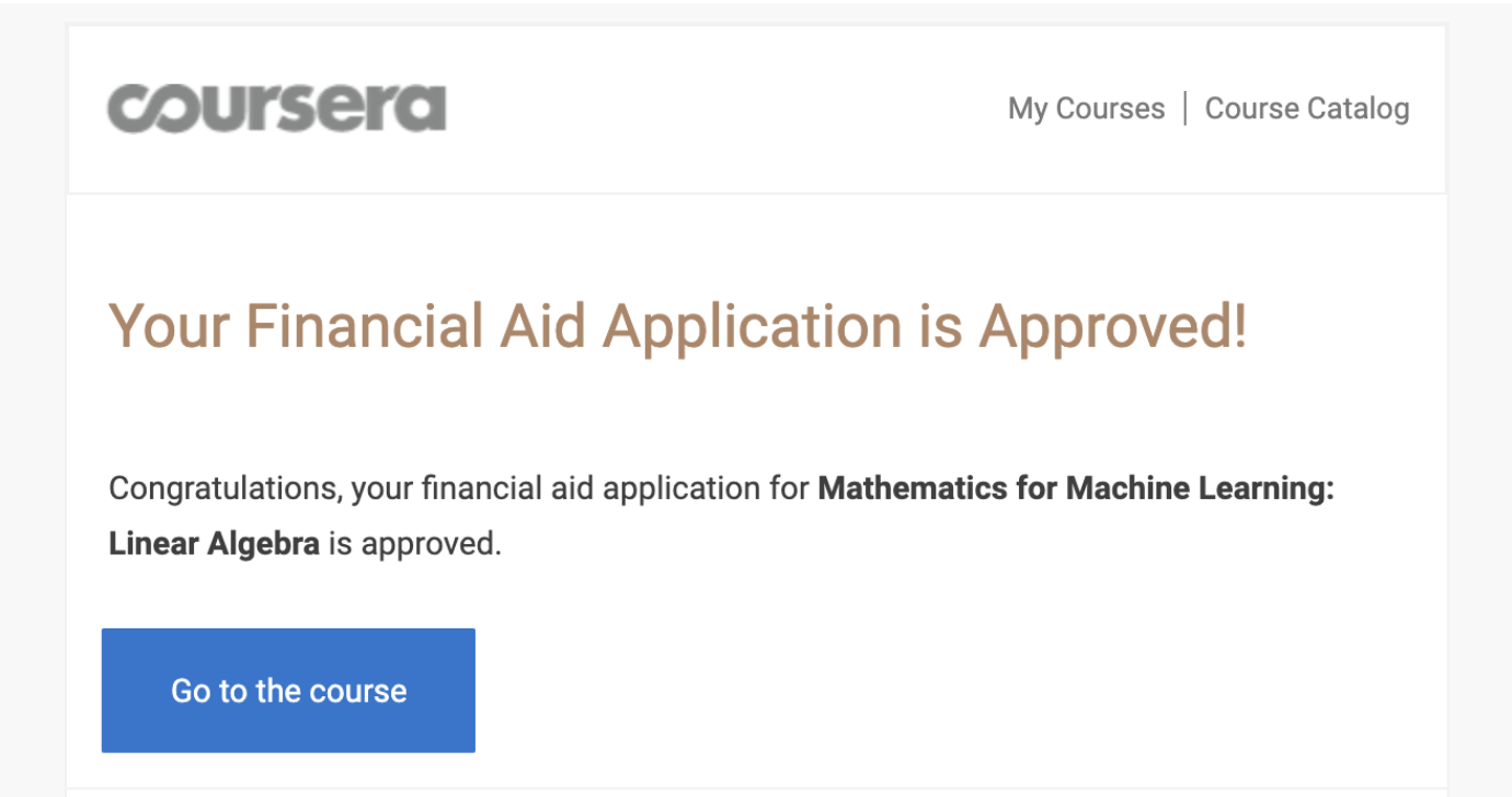本篇重點來啦 !如果你經濟上比較吃緊,但還是想要拿到證書的話,可以考慮申請看看獎學⾦ !這裡的獎學金並不是會給你一筆錢,而是申請的話,Coursera會免費讓你上完你有興趣的課程,且可以拿到證書。(Coursera中文網站把Financial aid翻譯做獎學金,所以這裡解釋一下)