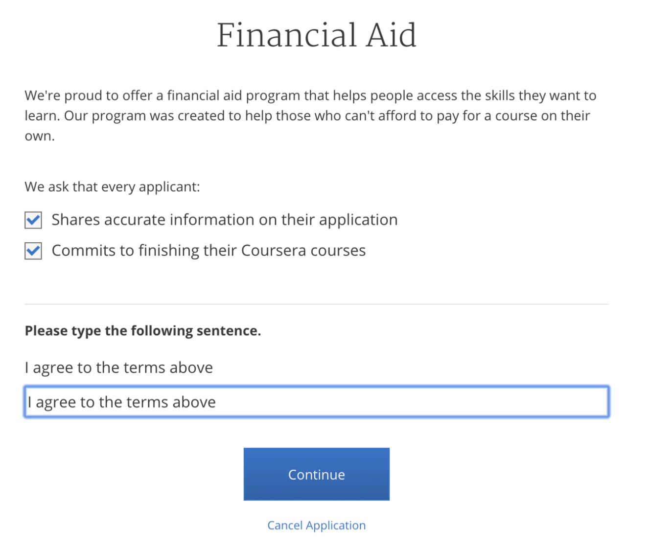 申請獎學⾦(財務資助) 本篇重點來啦 !如果你經濟上比較吃緊,但還是想要拿到證書的話,可以考慮申請看看獎學⾦ !這裡的獎學金並不是會給你一筆錢,而是申請的話,Coursera會免費讓你上完你有興趣的課程,且可以拿到證書。(Coursera中文網站把Financial aid翻譯做獎學金,所以這裡解釋一下) 以下是申請獎學⾦的步驟:
